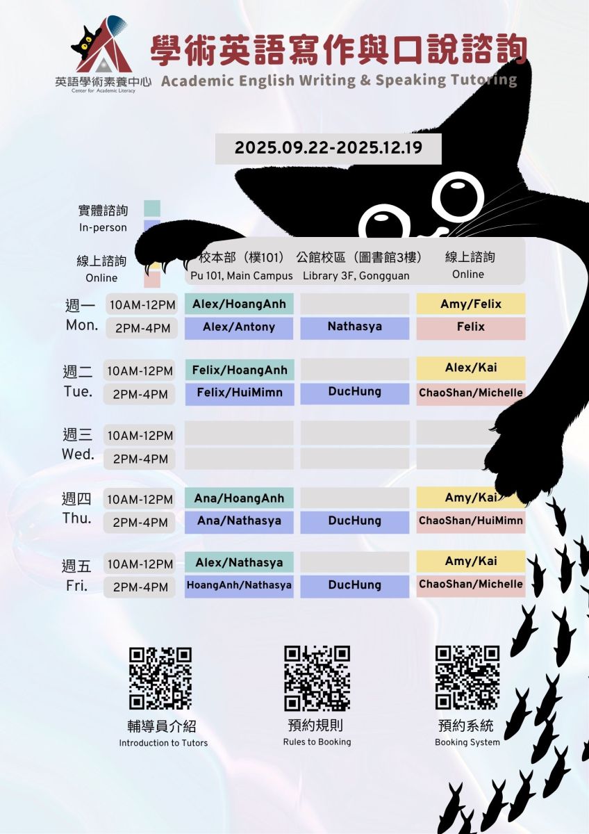 - 輔導員提供英文學術寫作、口說的一對一輔導,不提供翻譯、逐字修訂、校對、潤飾服務、求職面試、職場會話、生活會話諮詢。